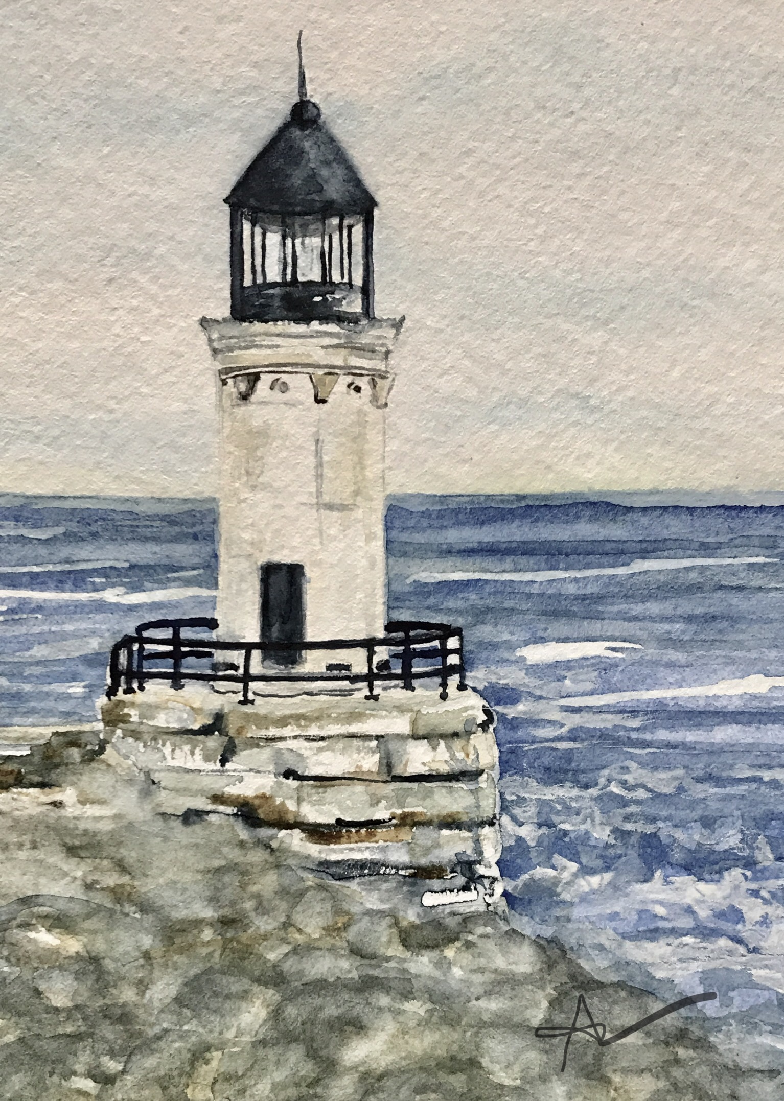 Nearly two years after the first lighthouse painting, I started by sketching lighthouses, this time using a photo model, to better understand perspective and form. That helped a lot! The first two paintings were generated from my imagined picture of a lighthouse scene, a vision equal parts primitive and inaccurate. I can see that clearly now.