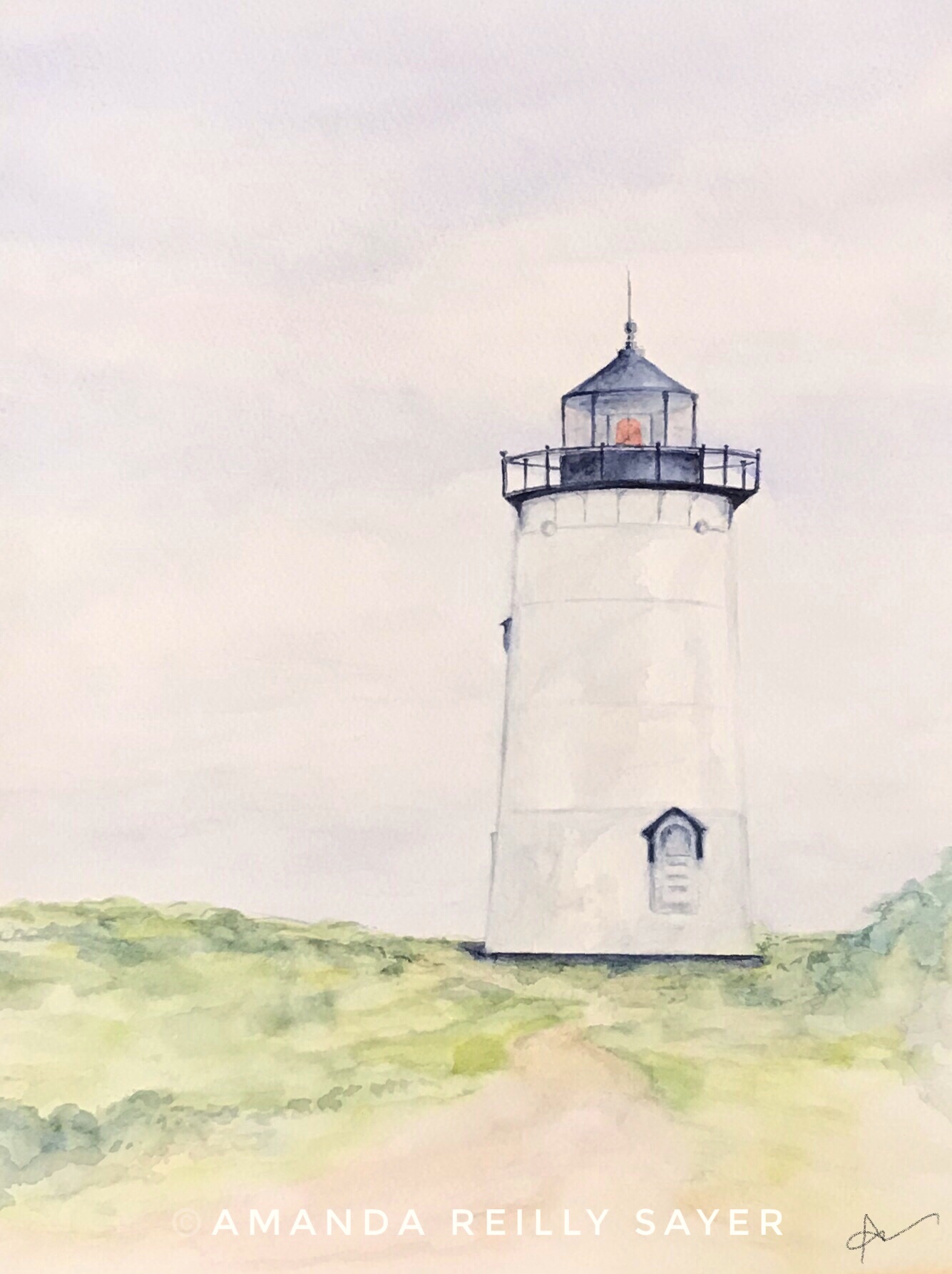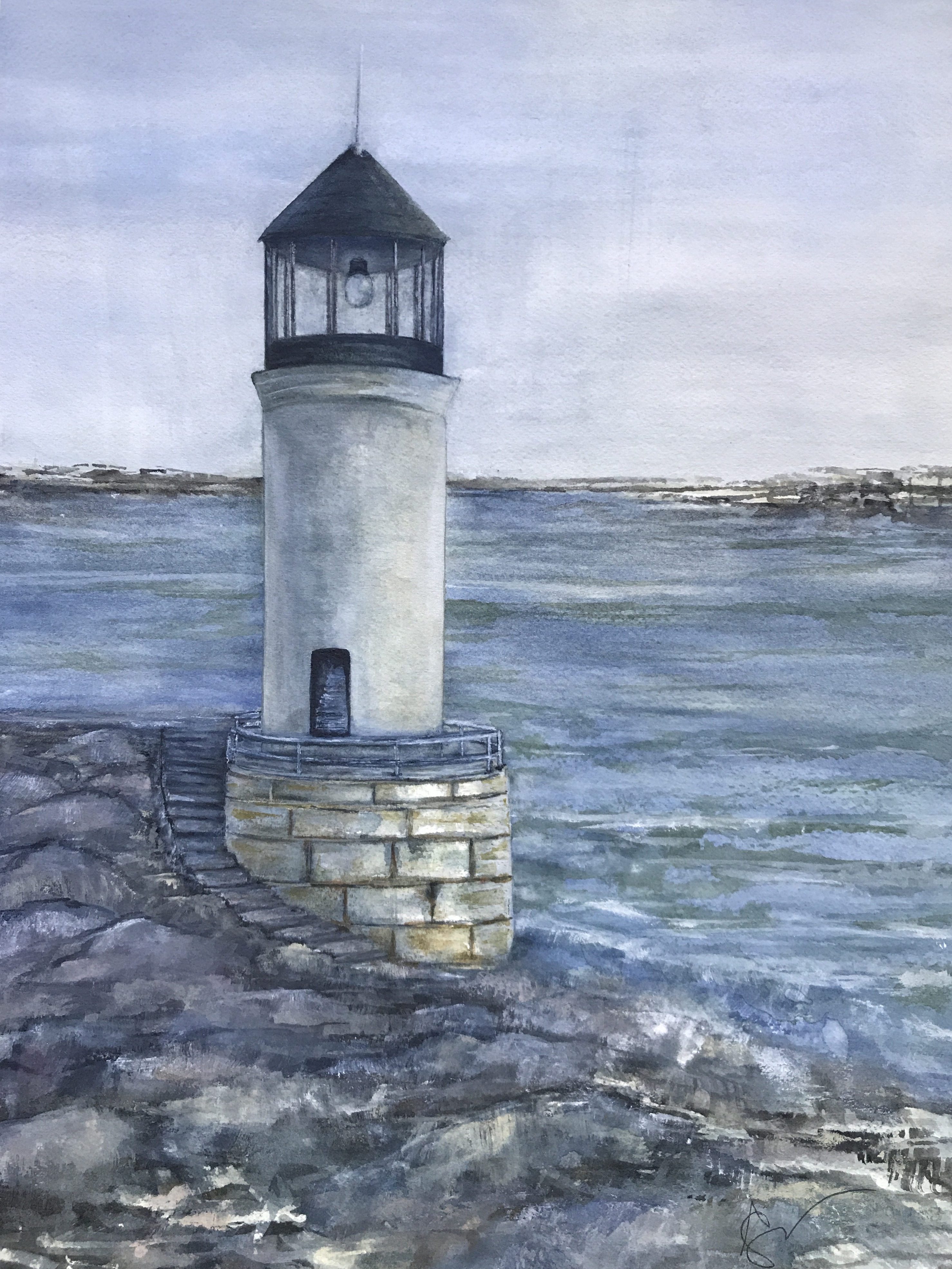 After I’ve finished a painting, I not uncommonly see new things and have impulses to change it. Away from it for a day, seeing it in my mind’s eye, I decided the sky should be a darker. When I shared that idea with my husband, he protested. The sky, almost indistinguishable from the lighthouse, is what he likes best about the painting. As a lover of metaphor, there are worse things – as we spread light, we may become one with the sky. I’ve quite a ways to go, but happy to be getting closer. Thanks for joining me on the journey!